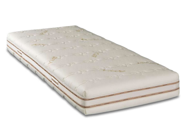 Materasso memory modello Bi-soya, sfrutta in maniera innovativa l'essenza di soya e la tecnosoya in fibra per ottenere, in modo naturale ed ecologico, una struttura a 7 zone con portanza media, capace di regalare un ottimo riposo senza affaticare la schiena.